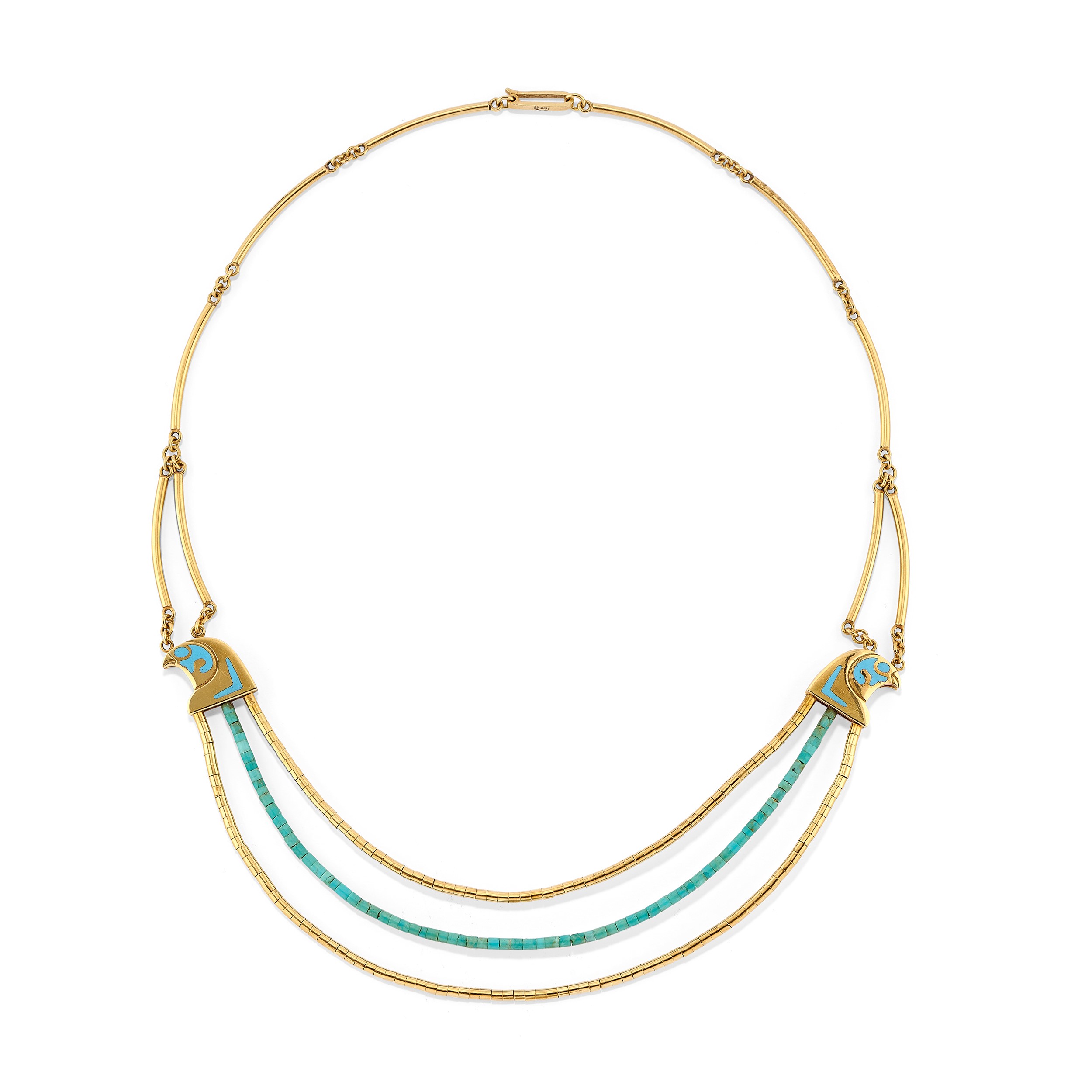 di gusto egizio composta da orecchini pendenti con chiusura a monachella e collana a tre fili rigidi in oro e turchesi con raffigurazioni del Dio Horus.
