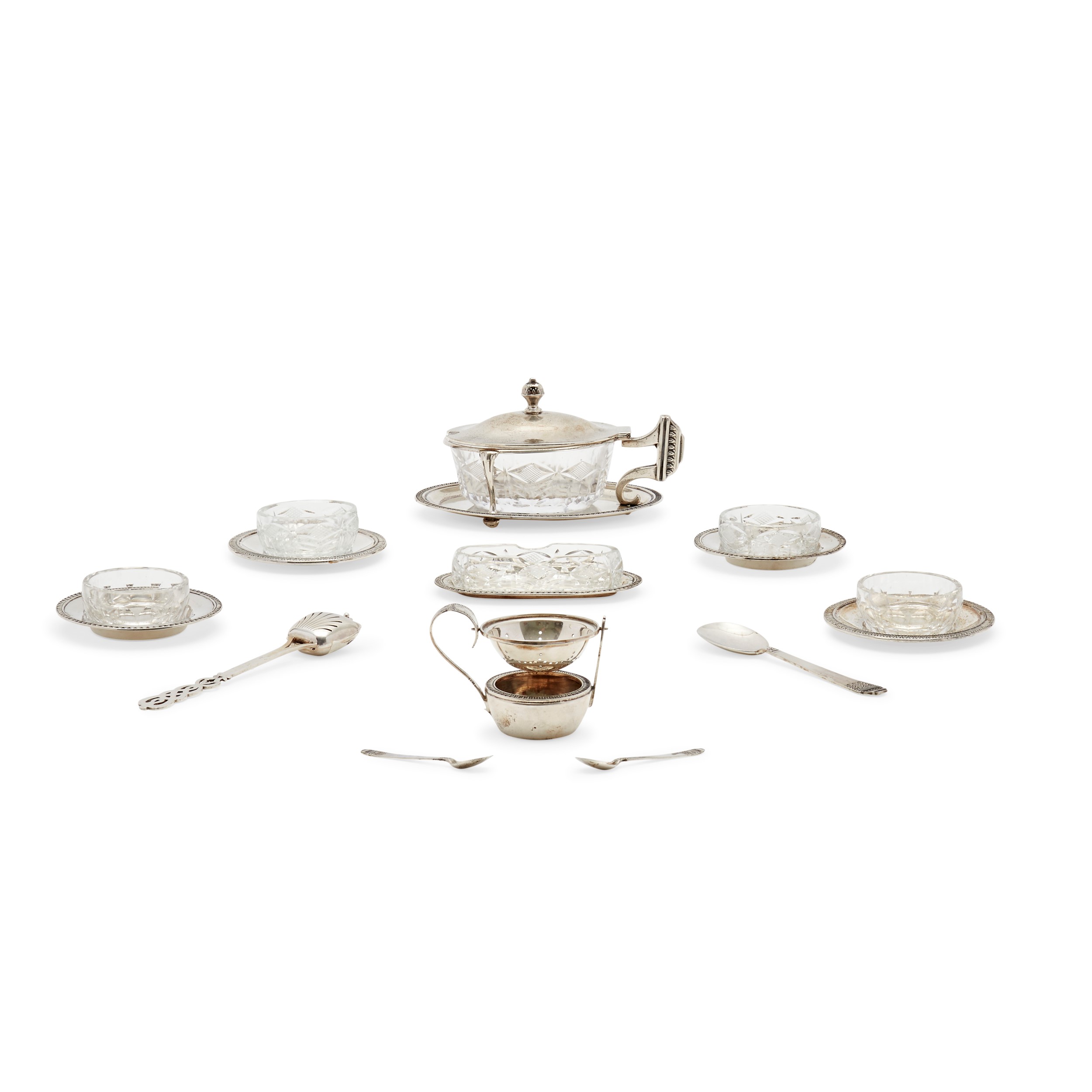 Formaggiera, cucchiaio da tè con colino, tre cucchiaini e quattro piattini in argento, [..]