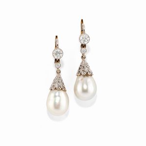 pendenti, con diamanti taglio vecchio per totale ct 0,50 circa, coppiglie in diamanti taglio huit-huit e perle [..]