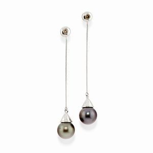 parte superiore con diamanti brown taglio brillante per totale ct 0,50 circa, terminali con perle coltivate Tahiti [..]