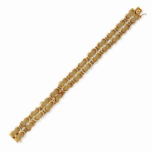 realizzato a cerchi in oro liscio e satinato, montatura estensibile. Peso g 34,23 misura 25