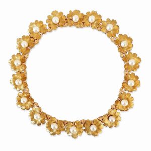 a girocollo con motivi a foglie zigrinate snodate, al centro perle coltivate di mm 8,00-8,50 circa, reca firma [..]