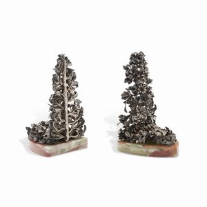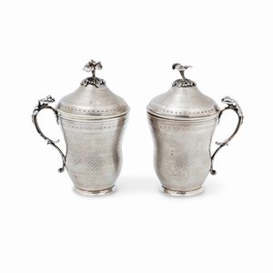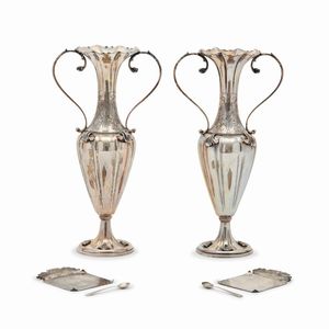 due vasi con manici a volute, due raccoglibriciole in lastra incisa e due cucchiaini lisci. Peso g 850,00 vasi [..]