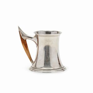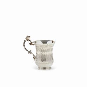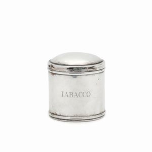 a corpo liscio con bordure godronate, reca iniziali Y.F.H incise. Peso g 190,00 h cm 9,00 diametro cm 8,50