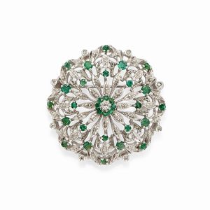 a forma di fiore con smeraldi taglio rotondo, diamanti taglio brillante e huit-huit. Peso g 14,70 cm 3,50