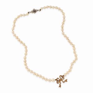 con pendente raffigurante figura femminile impreziosita da diamanti taglio brillante e perla coltivata di forma [..]