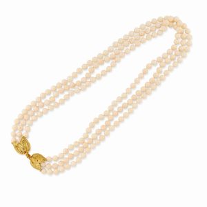 a tre fili di corallo bianco di mm 6,50 circa, chiusura con motivi fogliacei. Peso g 88,00 cm 50,00