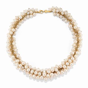 ad un filo di perle coltivate disposte a degradé di mm 7,00/5,00, pendente a fiocco decorato da microperle (una [..]