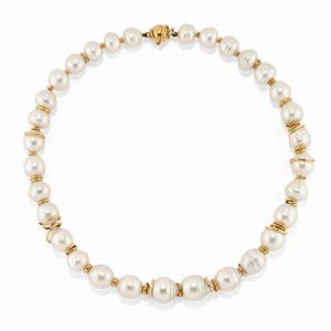 composta da collana e coppia di orecchini con perle coltivate barocche di mm 15,00-11,50 circa, motivi a spirale [..]