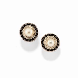 a bottone con perla centrale di mm 6,50 circa, diamanti taglio huit-huit e onice sfaccettato, chiusura perno e [..]