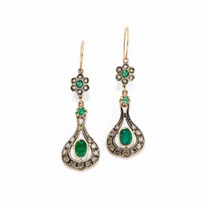 a motivo pendente traforato, interamente decorati da diamanti taglio rosa, al centro pietre dure verdi taglio [..]