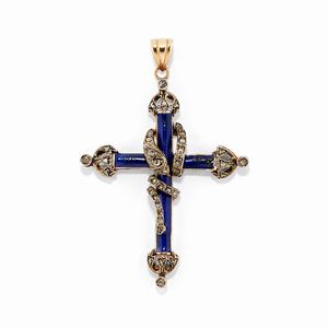motivo a croce in smalto blu e motivi in diamanti taglio rosa. Peso g 10,10 cm 6,50