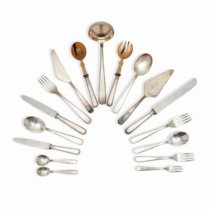 composto da 101 pezzi: 23 forchette (kg 1,60), 12 coltelli (kg 1,20), 18 cucchiai (kg 1,25), 12 forchette frutta [..]