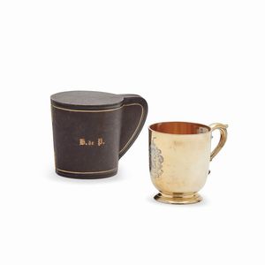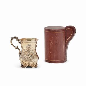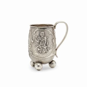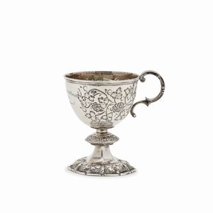 corpo con decori floreali, poggiante su quattro piedi zoomorfi, manico mosso, interno in vermeil. Peso g 170,00 [..]