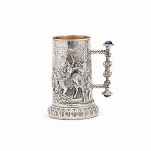 di forma cilindrica con corpo sbalzato rappresentante l'entrata a Parigi di Enrico IV, manico con lapislazzuli [..]
