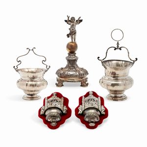 composto da: due secchielli, un globo con putto e due acquasantiere entro cornice, difetti (mancanze di materiale). [..]