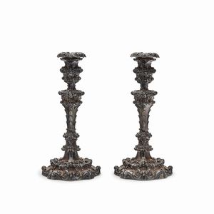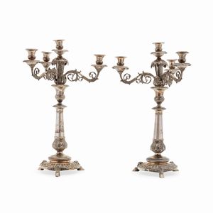 a quattro fiamme, base circolare su tre piedini zoomorfi, decori a sbalzo e pellacce. Peso kg 1,230 h cm 51,00