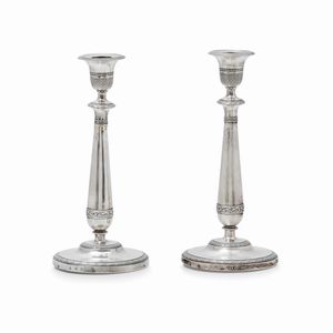 base rotonda, in stile Impero con decoro floreale, difetti (segni di saldatura). Peso lordo g 906,40 (comprensivo [..]