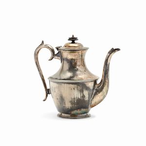corpo piriforme allungato, manico liscio, poggiante su tre piedini a sfera, due medaglioni realizzati a sbalzo [..]