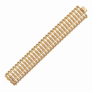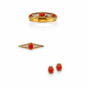 composta da bracciale rigido, spilla e coppia di orecchini con chiusura perno e clip, decoro in filo d'oro ritorno [..]