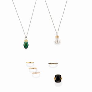 composti da due pendenti con catena e tre anelli, decorati da diamanti taglio brillante, di diverse raffigurazioni. [..]