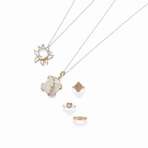 composto da due pendenti con catena, cinque anelli decorati da diamanti taglio brillante, di diverse raffigurazioni. [..]