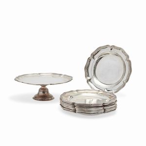 quattro piatti, due porta bottiglie e un vaso ad anfora. Peso kg 1,160 diametri cm 25,50-24,00-18,00-16,50 [..]
