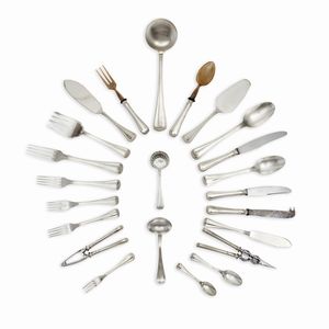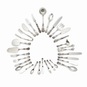 composto da 121 pezzi: 12 cucchiai, 22 forchette, 12 coltelli, 8 forchette da frutta, 12 coltelli da frutta, [..]