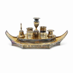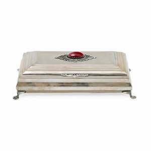 di forma rettangolare con bordo godronato, interno in vermeil, reca firma Marcenaro Genova. Peso g 721,00 cm [..]