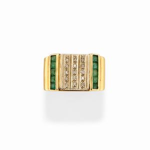a fascia con al centro diamanti taglio huit-huit, ai lati smeraldi taglio carré. Peso g 9,20 misura 17