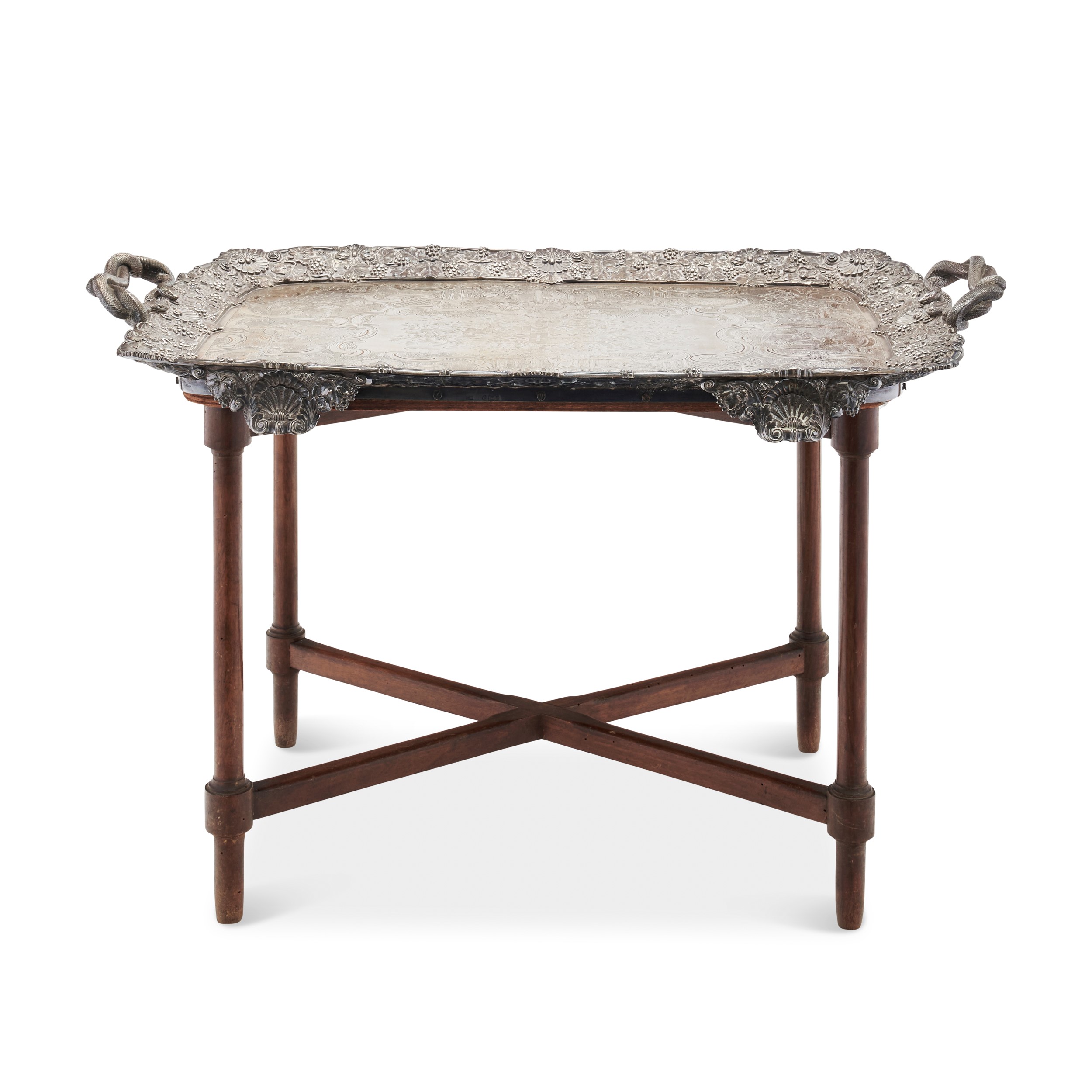 di forma rettangolare, gusto naturalistico in stile revival rococò, poggiante su quattro piedi a conchiglia, prese a serpenti,bordo con ricco decoro sbalzato a conchiglie e tralci d’uva con foglie e grappoli, parte centrale imperniata con raffinate incisioni eseguite a cesello, al centro stemma nobiliare, con tavolino in legno.