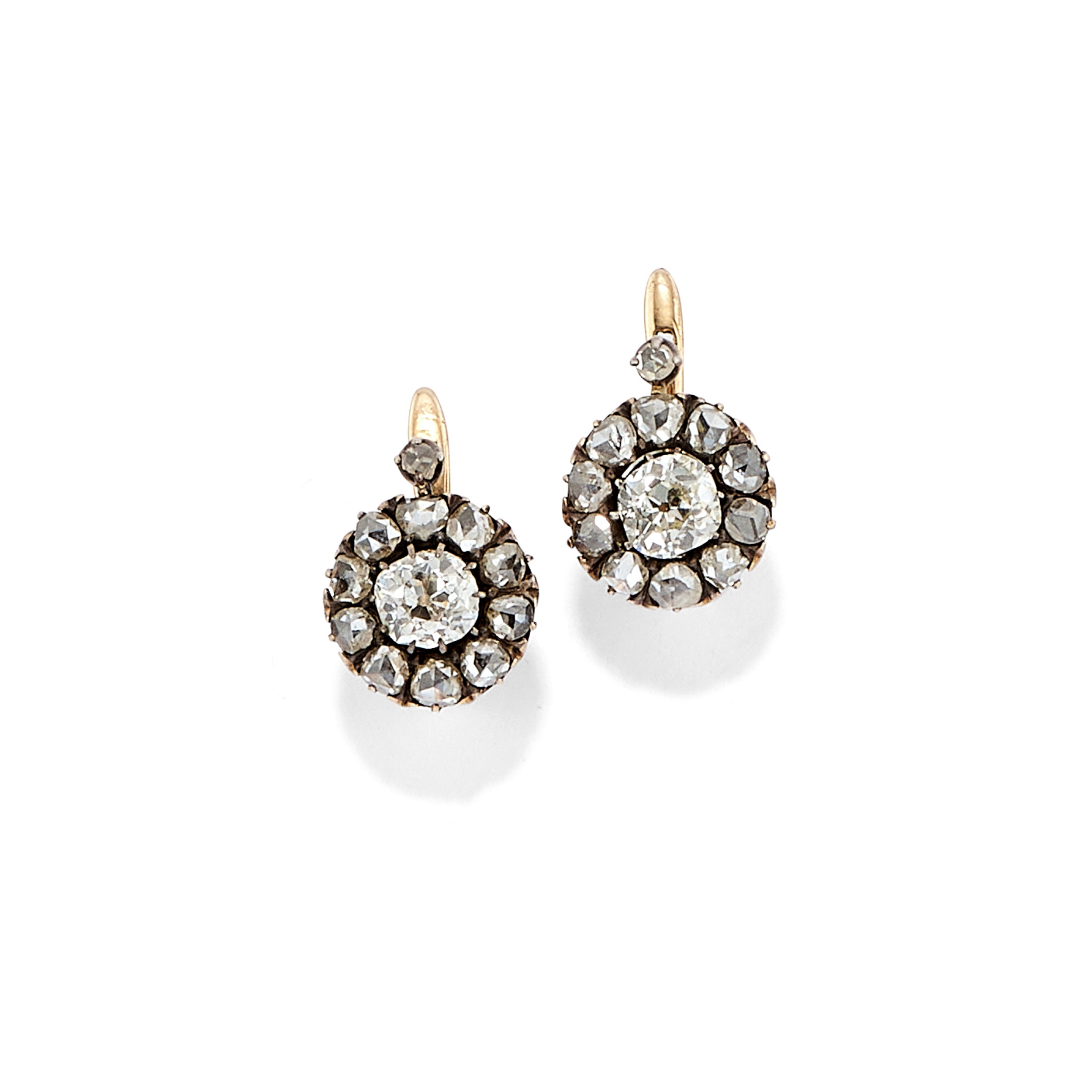 realizzati a fiore, al centro diamanti taglio vecchio per totale ct 1,00 circa e contorno in diamanti taglio rosa, chiusura perno e clip.