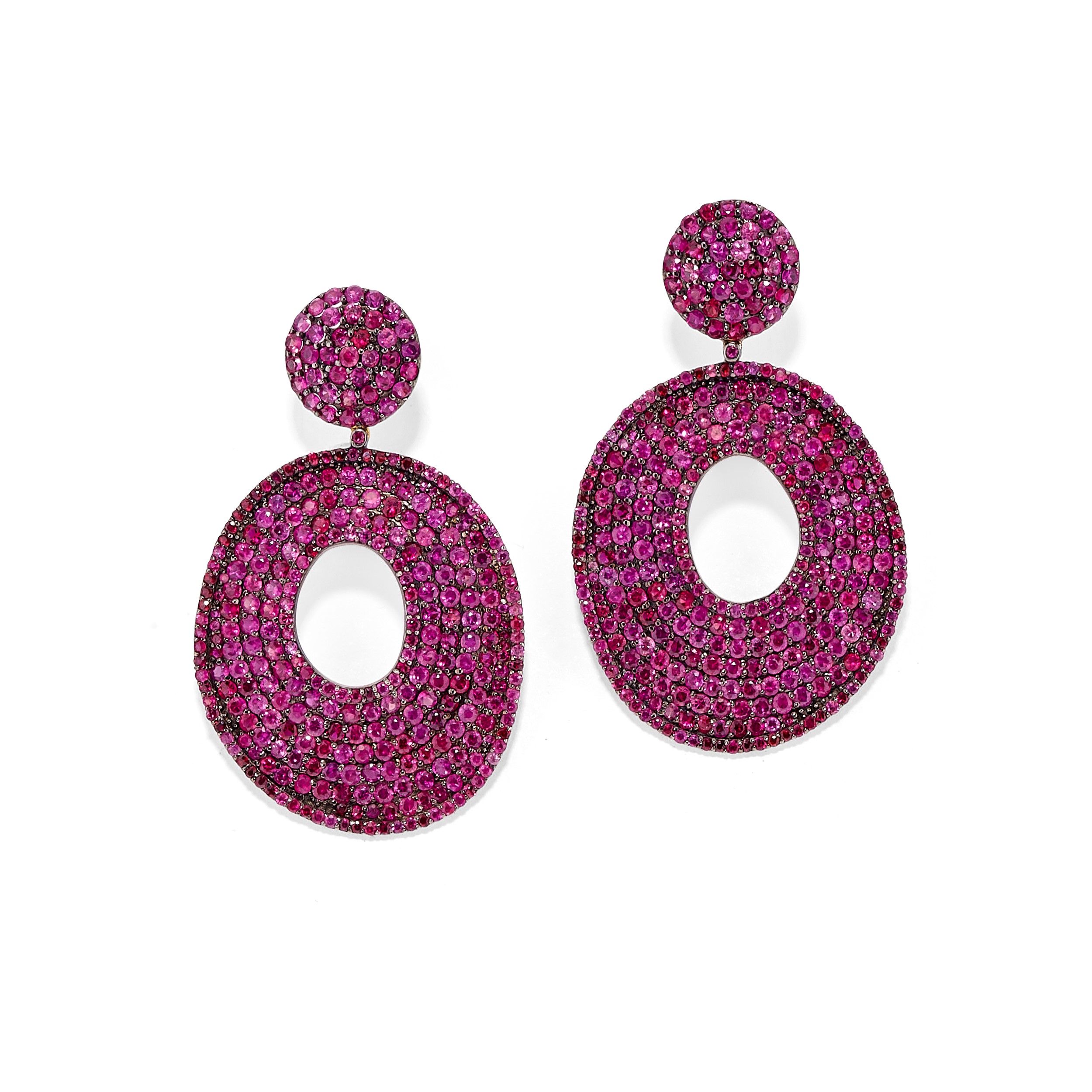 pendenti a doppio corpo di forma ovale interamente decorati da rubini taglio rotondo per totale ct 17,60, chiusura perno e farfalla.