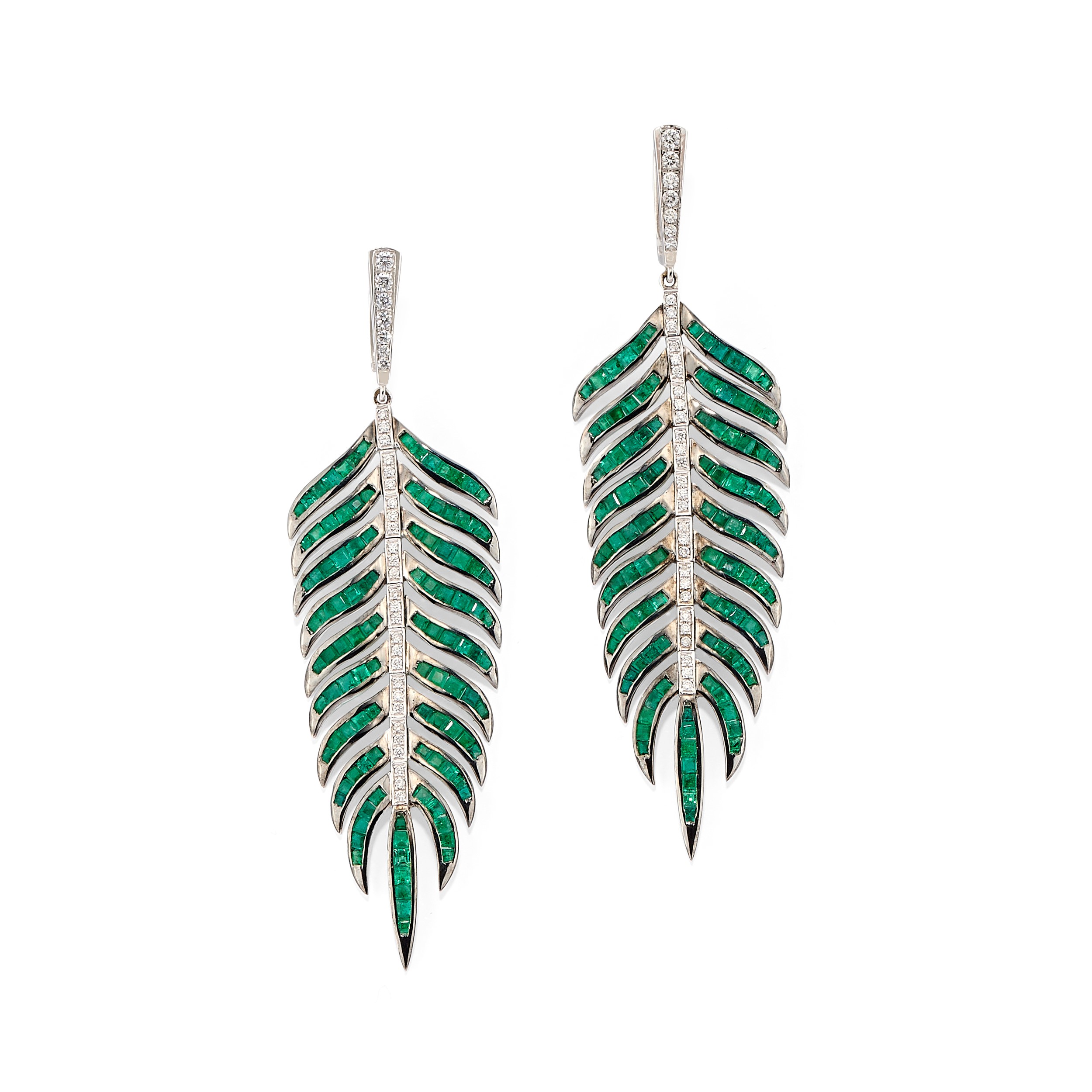 con motivo pendente a piuma, decorato da smeraldi taglio carrè per totale ct 8,50 circa e diamanti taglio brillante per totale ct 0,60 circa, chiusura a monachina.