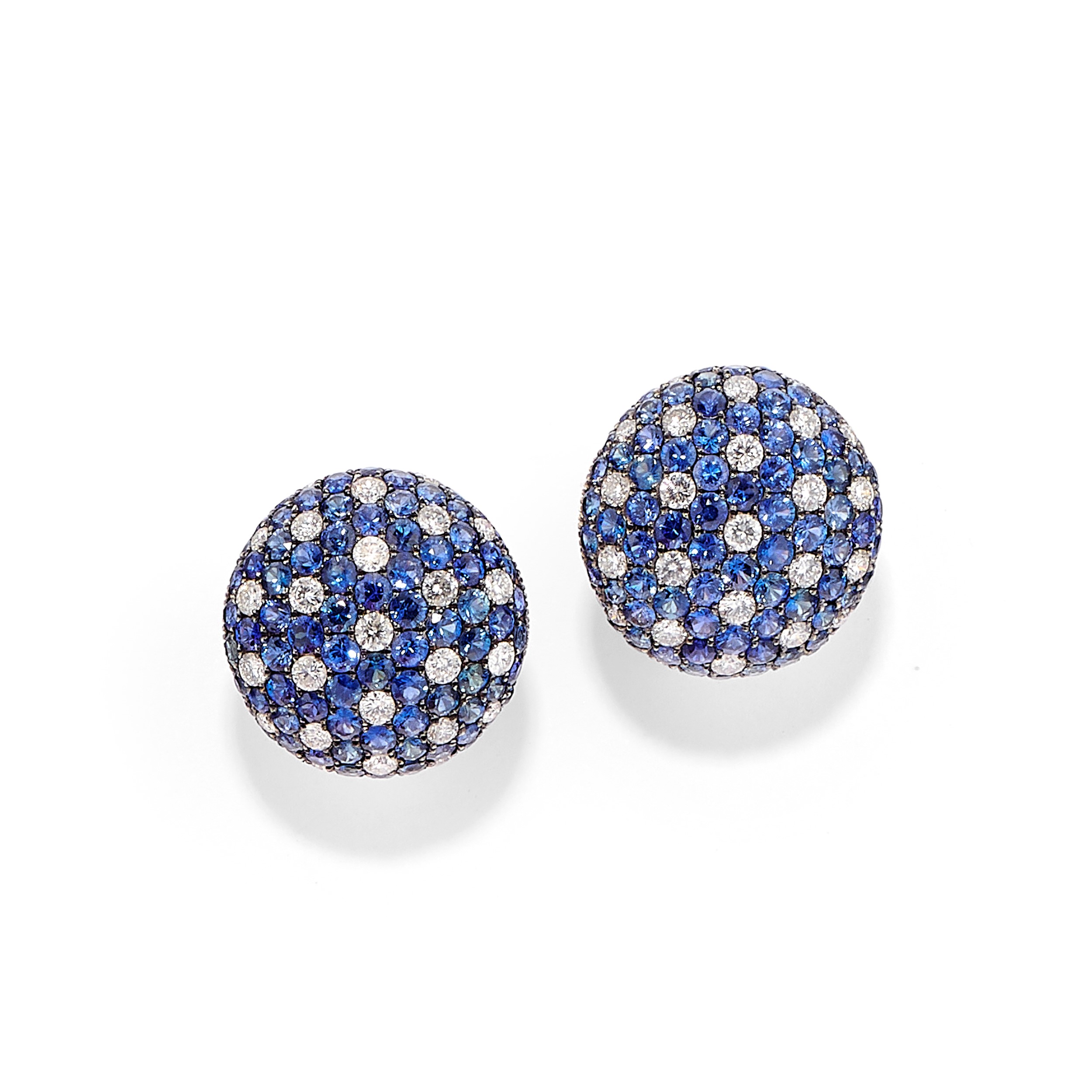 a bottone, interamante decorati da diamanti taglio brillante per totale ct 1,30 circa e zaffiri taglio rotondo per totale ct 8,20 circa, chiusura perno e clip.