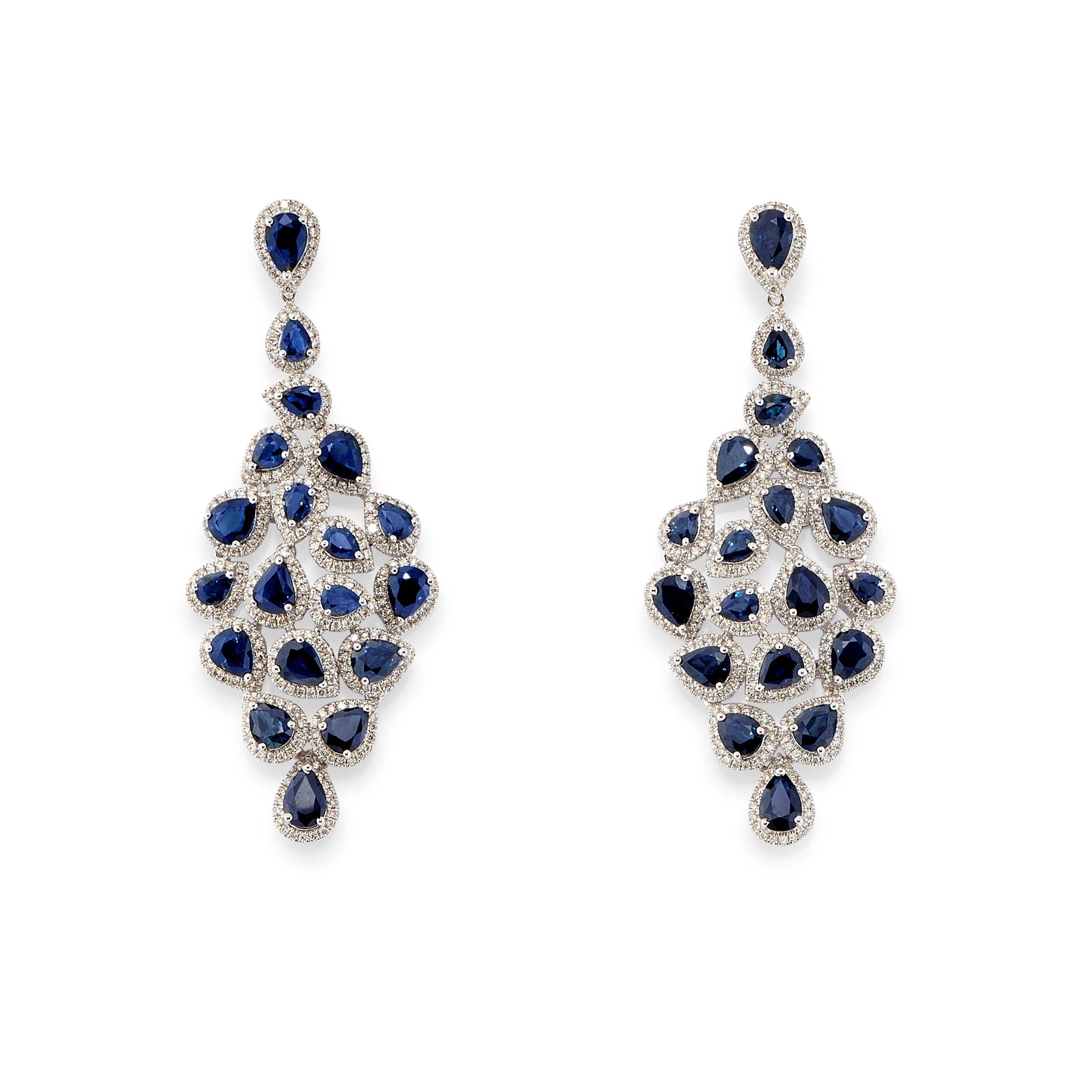 pendenti con motivi a goccia in zaffiri taglio goccia per totale ct 12,50 circa e diamanti taglio brillante per totale ct 1,90 circa, chiusura perno e farfalla.