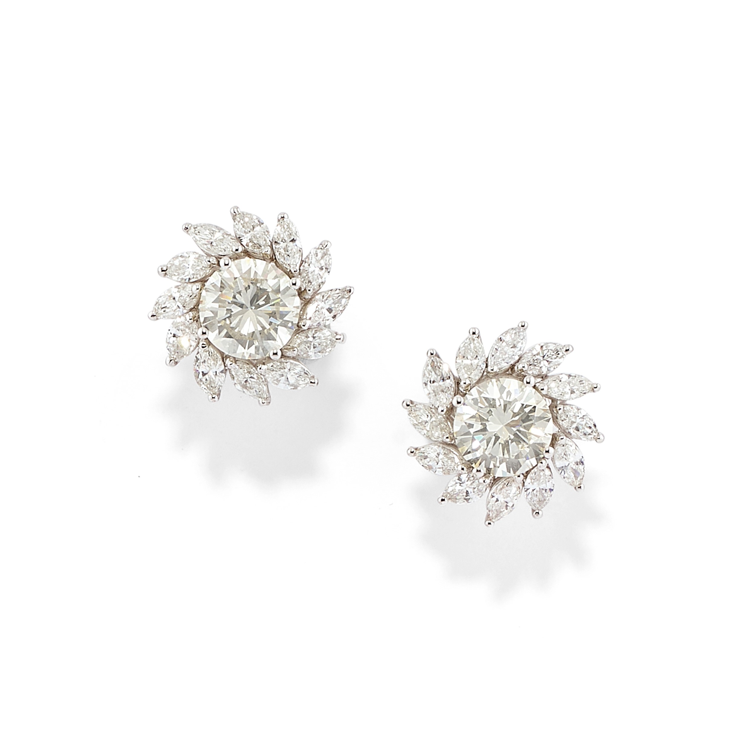 a fiore con al centro due diamanti taglio brillante per totale ct 4,40 circa, prob. colore N/O, purezza VS, contorno in diamanti taglio navette per totale ct 2,50 circa, chiusura perno e farfalla.