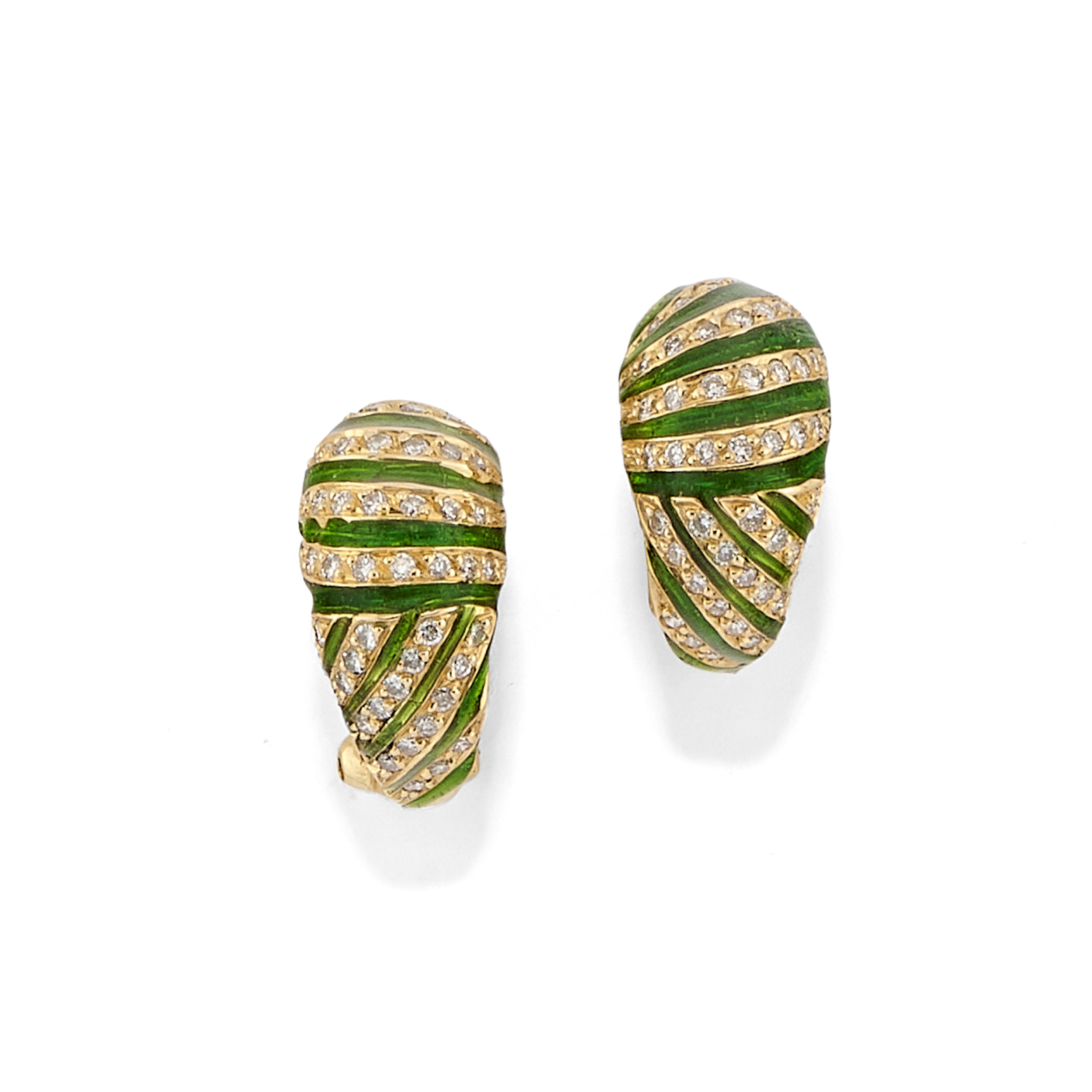 bombati con motivo rigato alternato da diamanti taglio brillante e smalto verde, chiusura a clip.