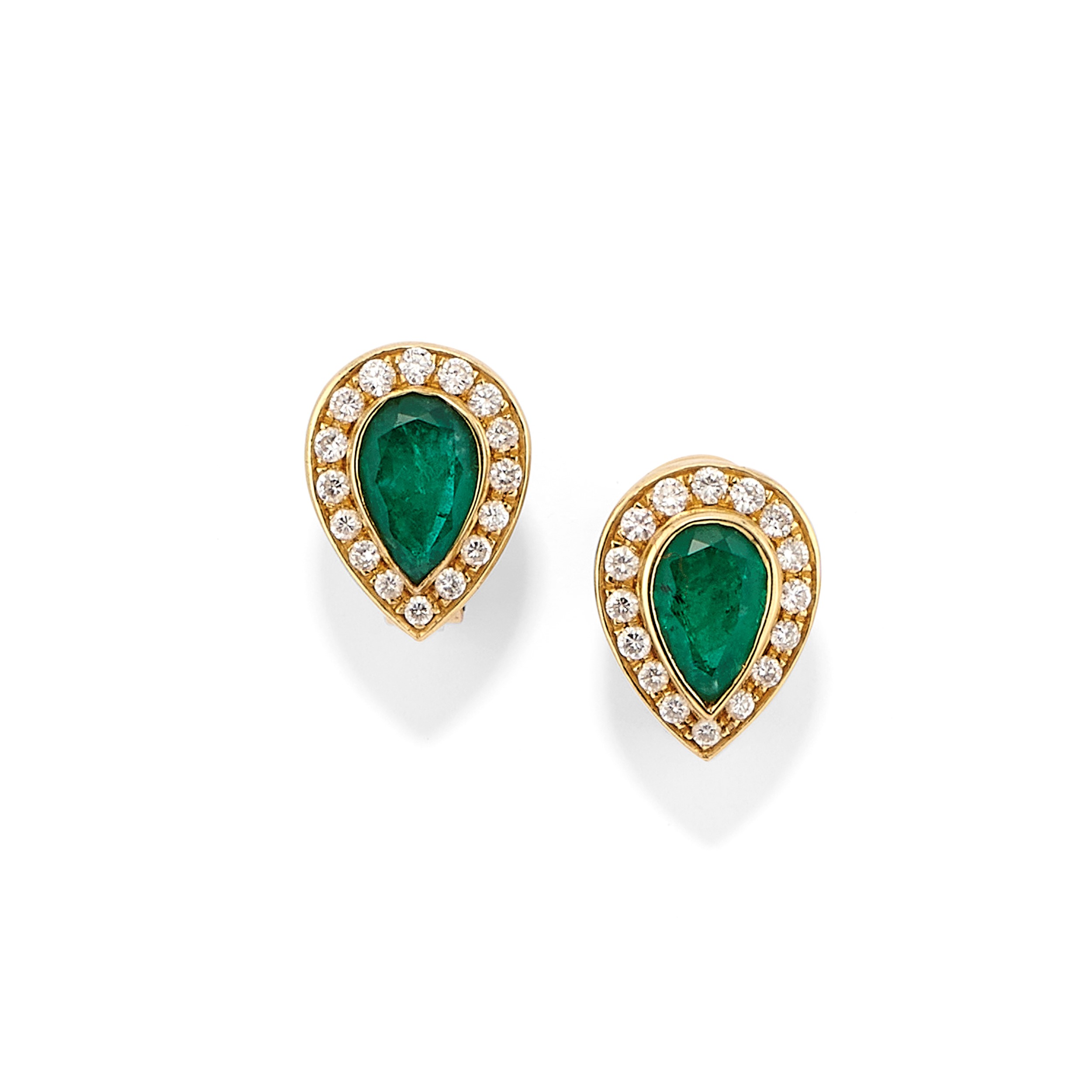 disegno a goccia, al centro smeraldi taglio goccia per totale ct 2,60 circa, contorno in diamanti taglio brillante per totale ct 2,60 circa, chiusura perno e clip.