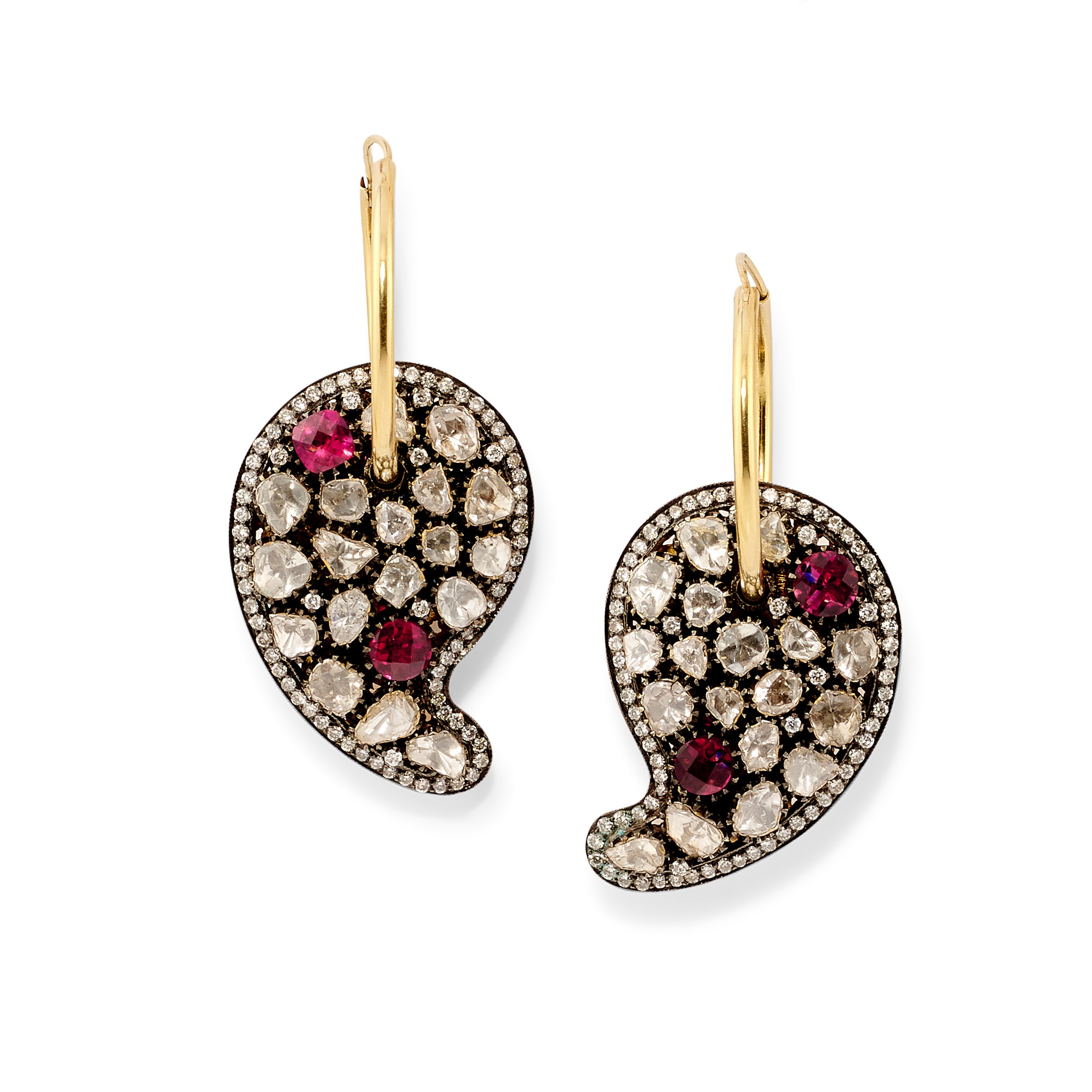 formati da cerchi in oro giallo che trattengono motivi pendenti a disegno cachemire decorati da diamanti taglio brillante e diversi per totale ct 5,30 circa e tormaline taglio rotondo briolette per totale ct 2,80 circa. Peso g 32,50 cm 6,00