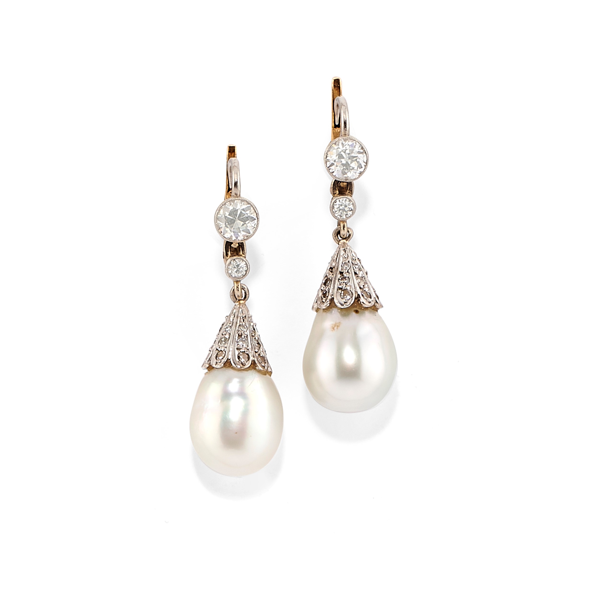 pendenti, con diamanti taglio vecchio per totale ct 0,50 circa, coppiglie in diamanti taglio huit-huit e perle di mm 11,00x10,00 e 12,00x10,00 circa (prob. naturali).