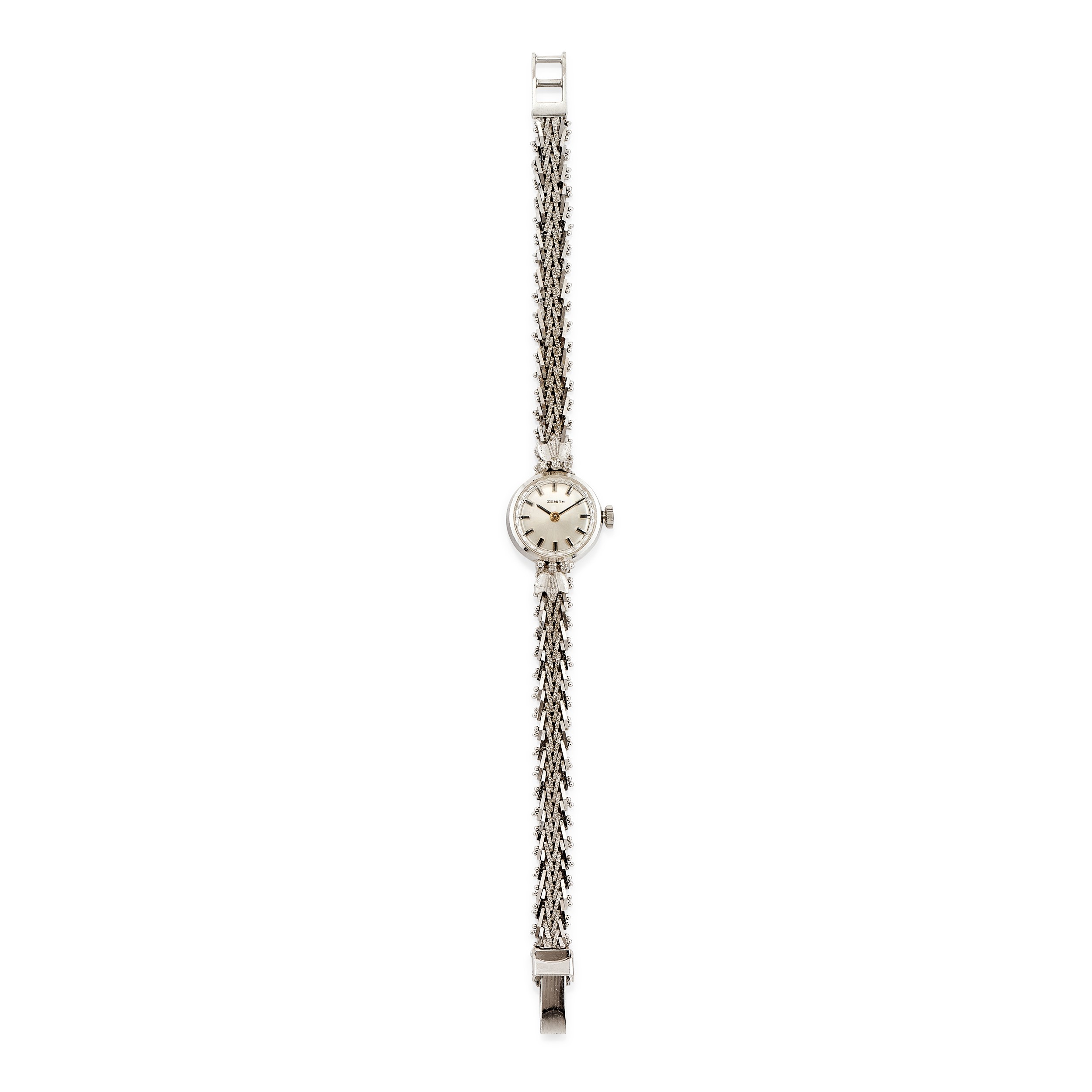 cassa rotonda, quandrante argenteč, indici applicati, carica manuale, bracciale integrato impreziosito da piccoli diamanti taglio huit-huit, con astuccio.