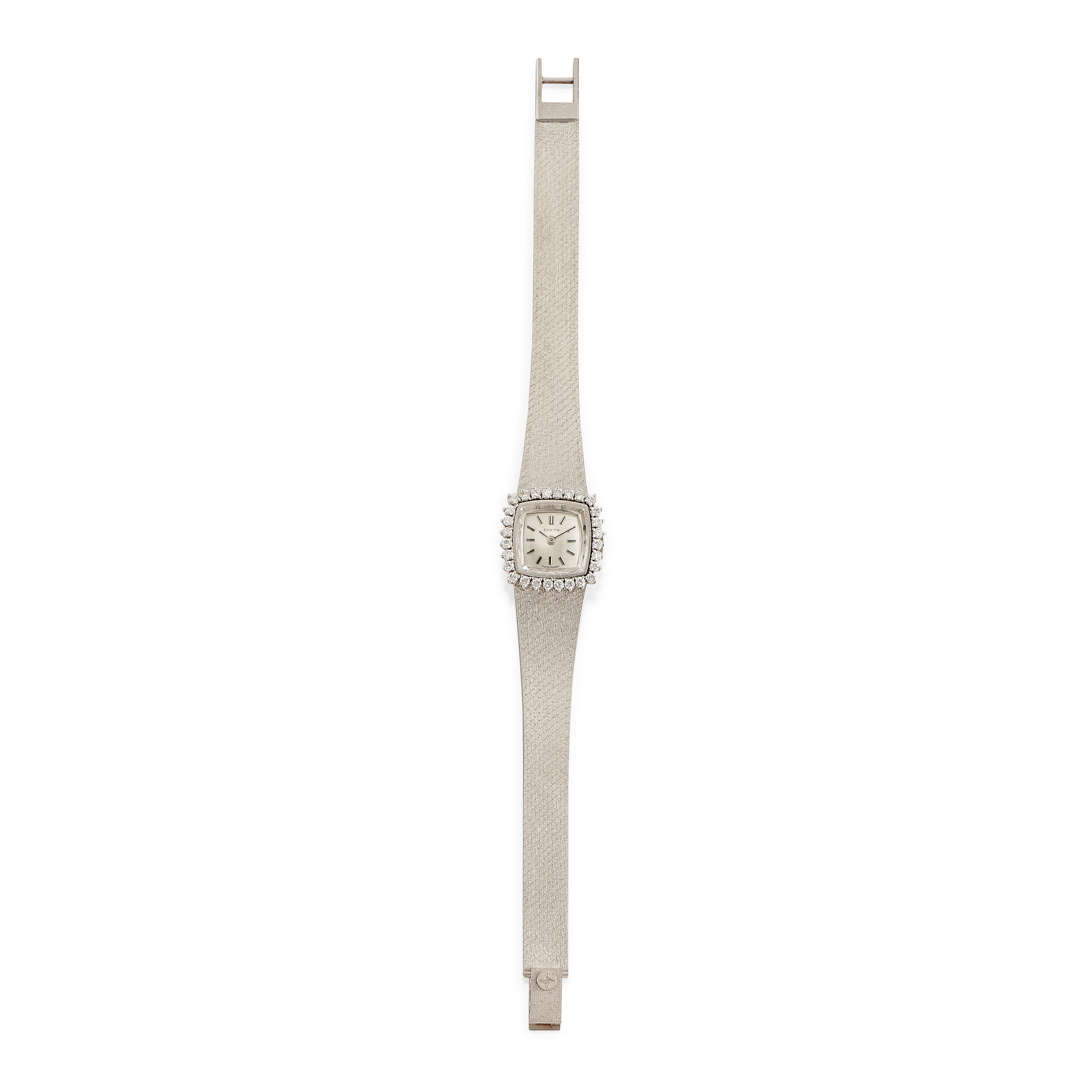 cassa quadrata, quadrante chiaro con indici applicati, lunetta in diamanti taglio brillante, movimento a carico manuale, bracciale integrato.