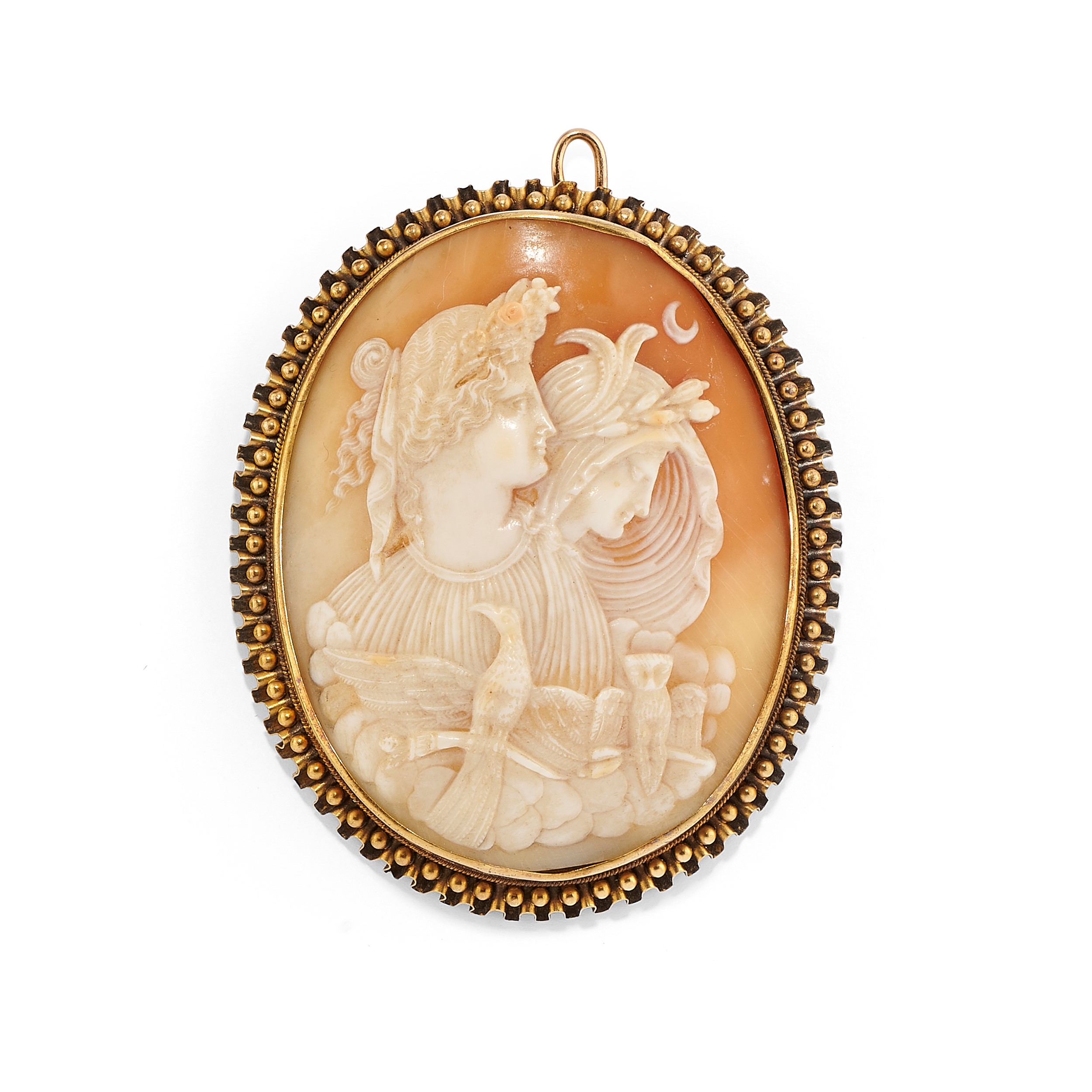 di forma ovale con cammeo scolpito in altorilievo su conchiglia a profili femminili, vetro al retro.