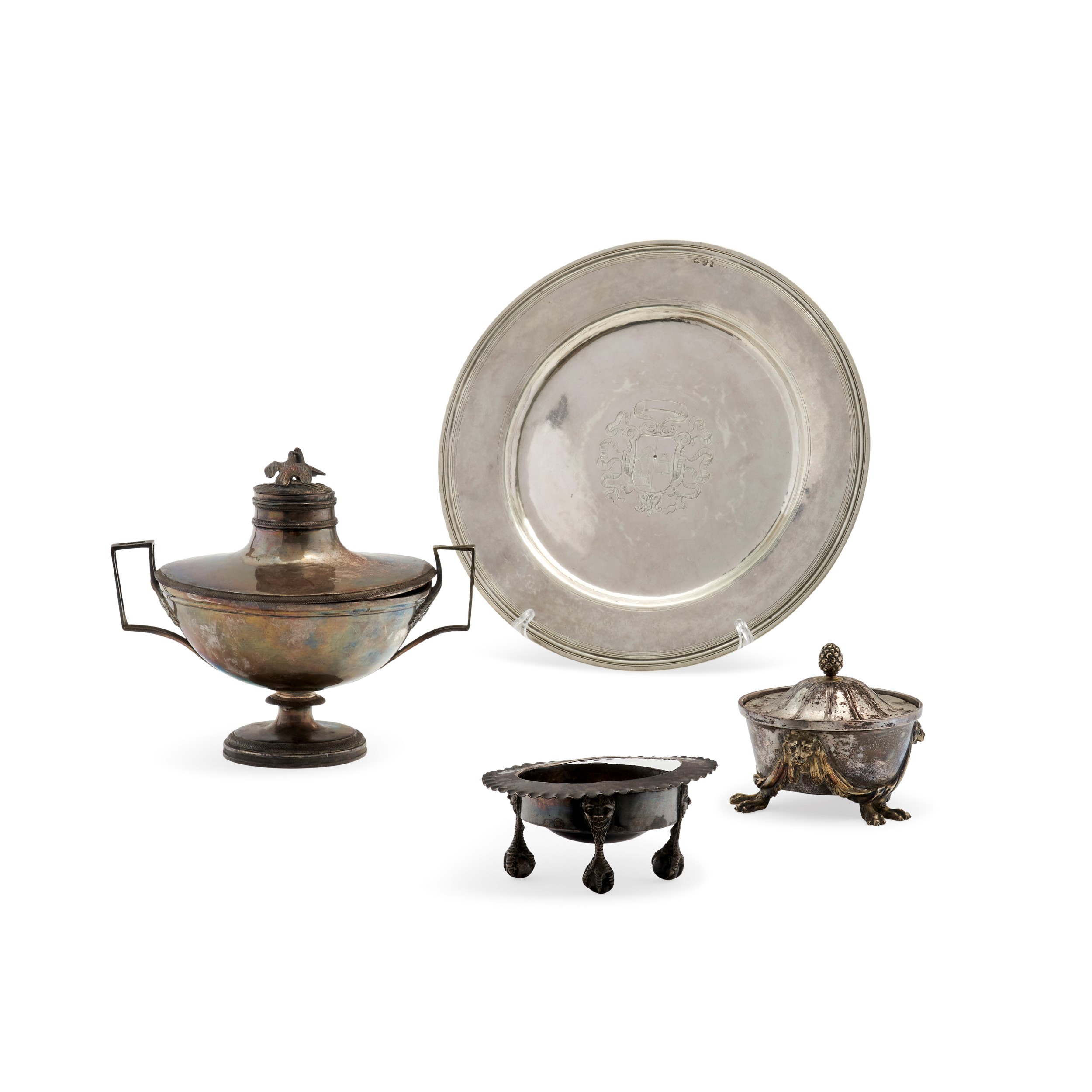 composto da un piatto Città del Vaticano con stemma Pontificio al centro, una scatola in ottone argentato Città del Vaticano, una zuccheriera decò con pomello a due colombe ed un'alzatina con piedini zoomorfi, difetti (rotture, un piedino da saldare).