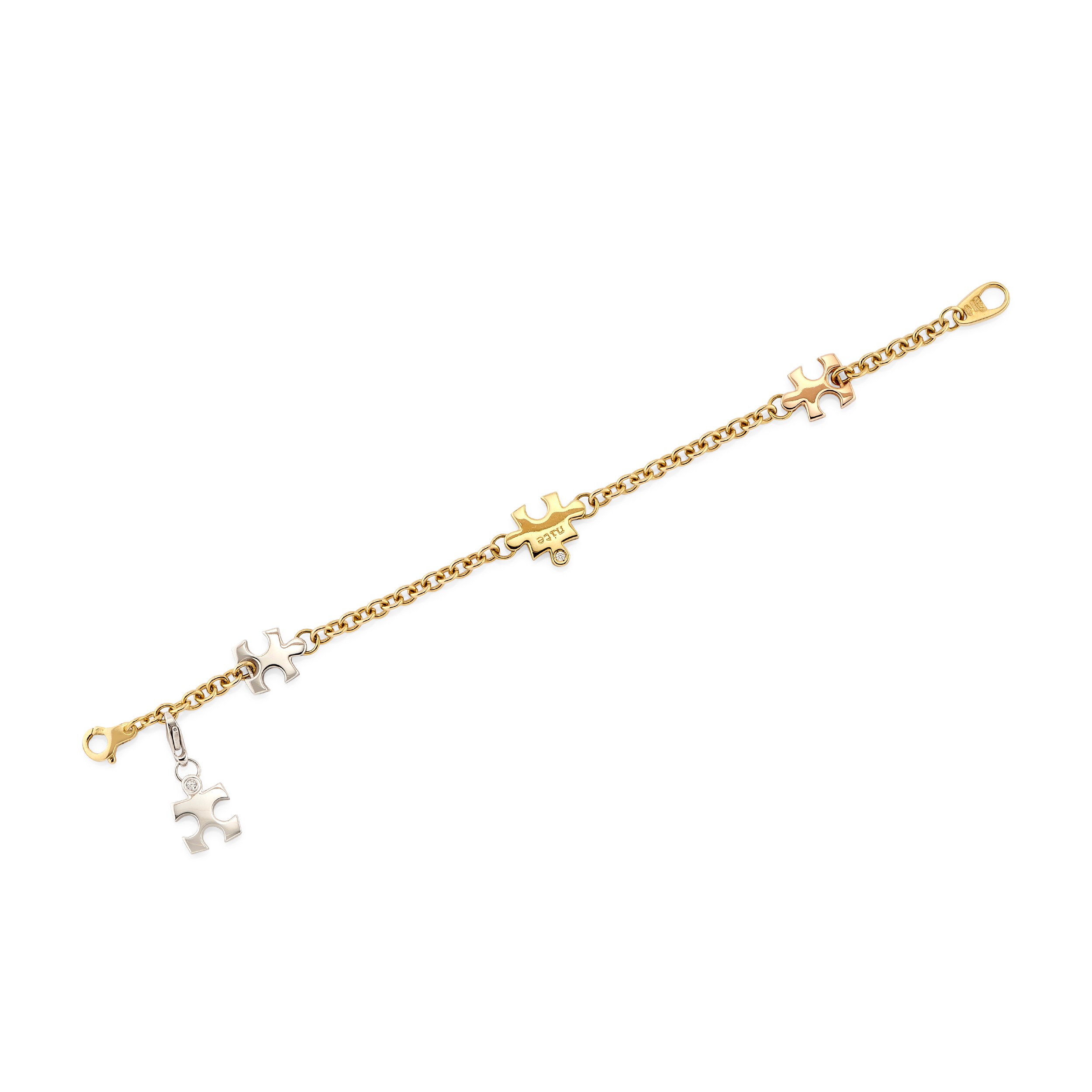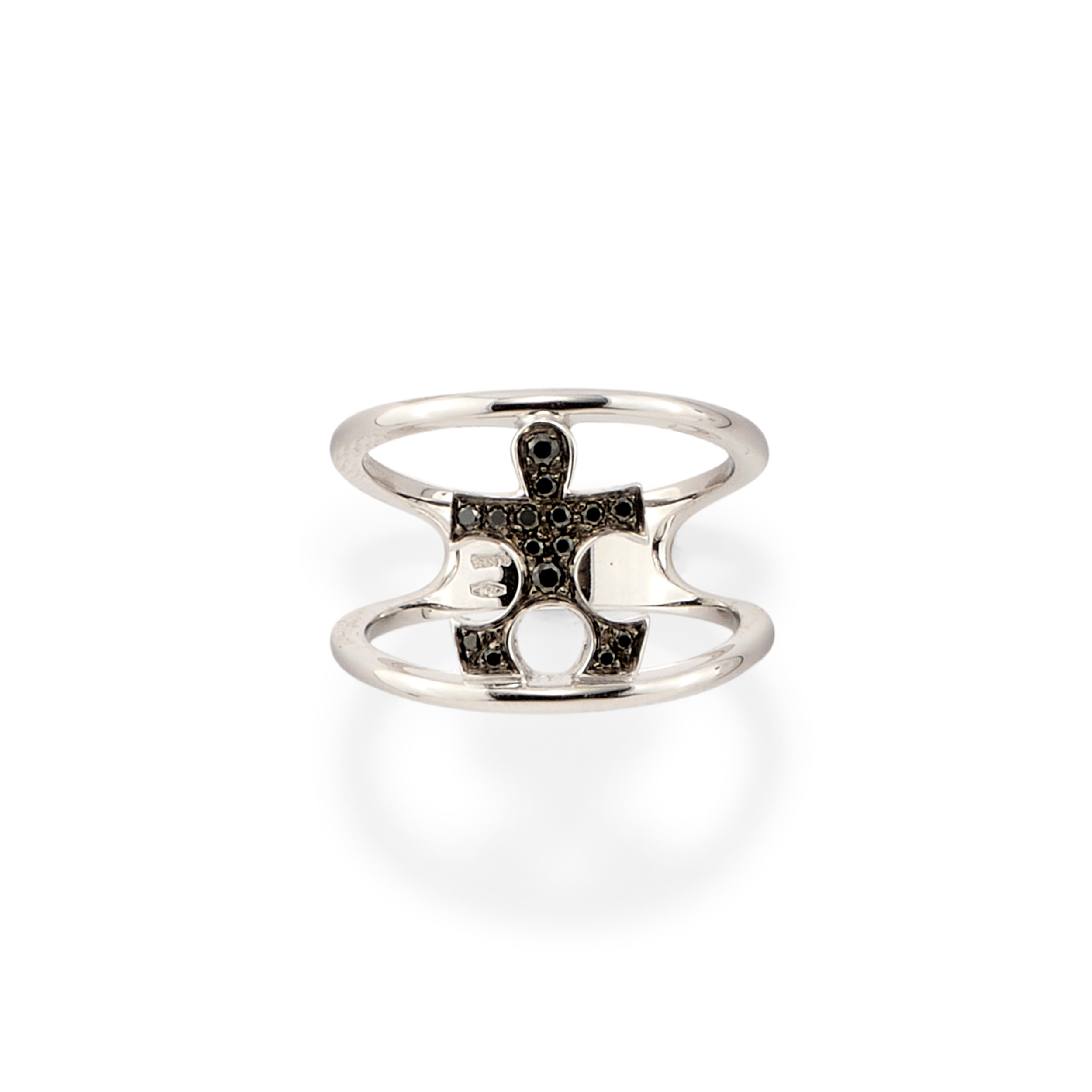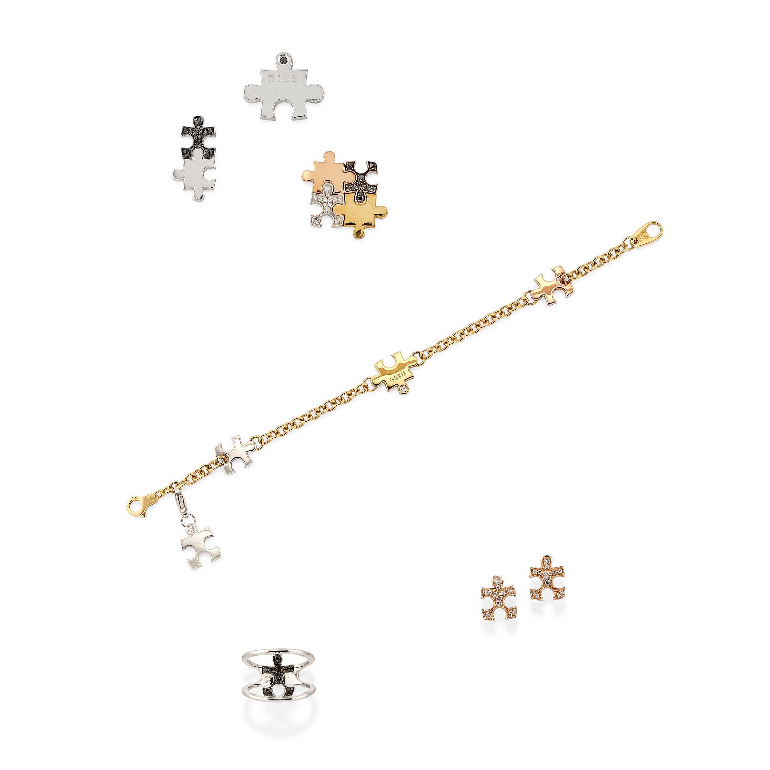 composti da un bracciale, tre pendenti, un anello e una coppia di orecchini, con motivo a puzzle impreziosito da diamanti taglio brillante incolori e neri.