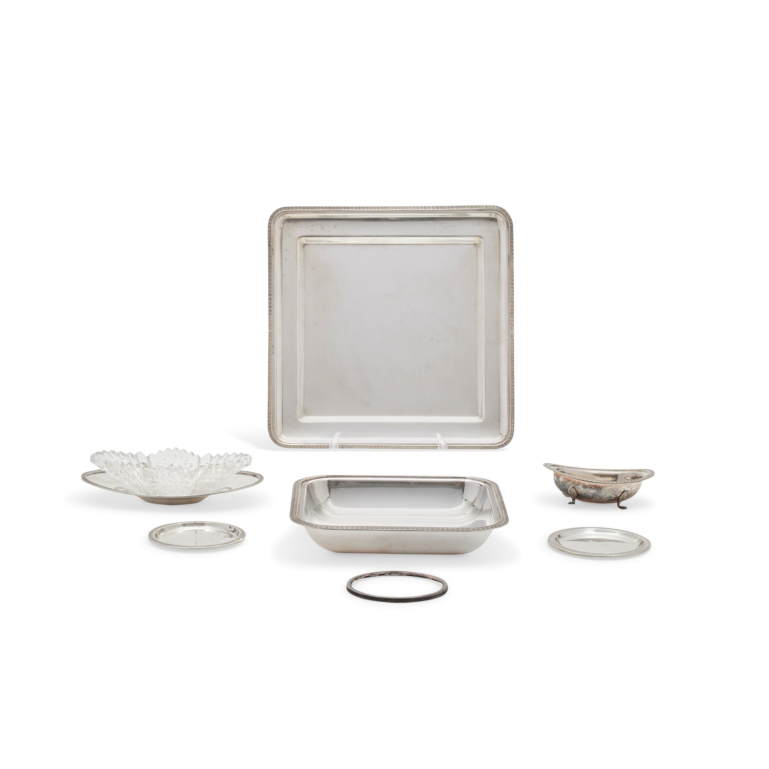 due piatti centrotavola di forma quadrata, un portaformaggio ovale, due piattini, una piccola zuccheriera, difetti (un piedino della zuccheriera mancante).
