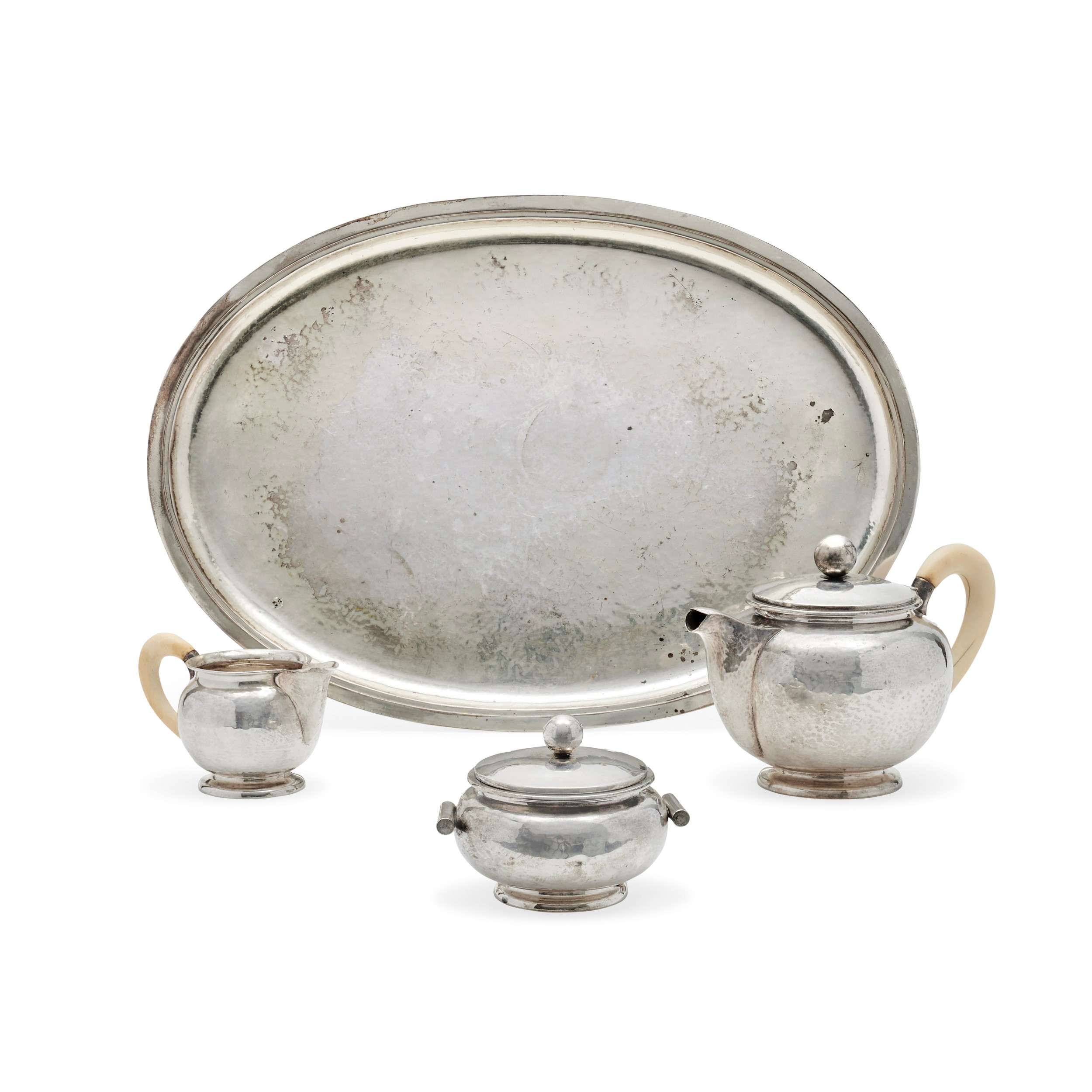 composto da vassoio di forma ovale, teiera, lattiera, zuccheriera a corpo liscio con decoro martellato.