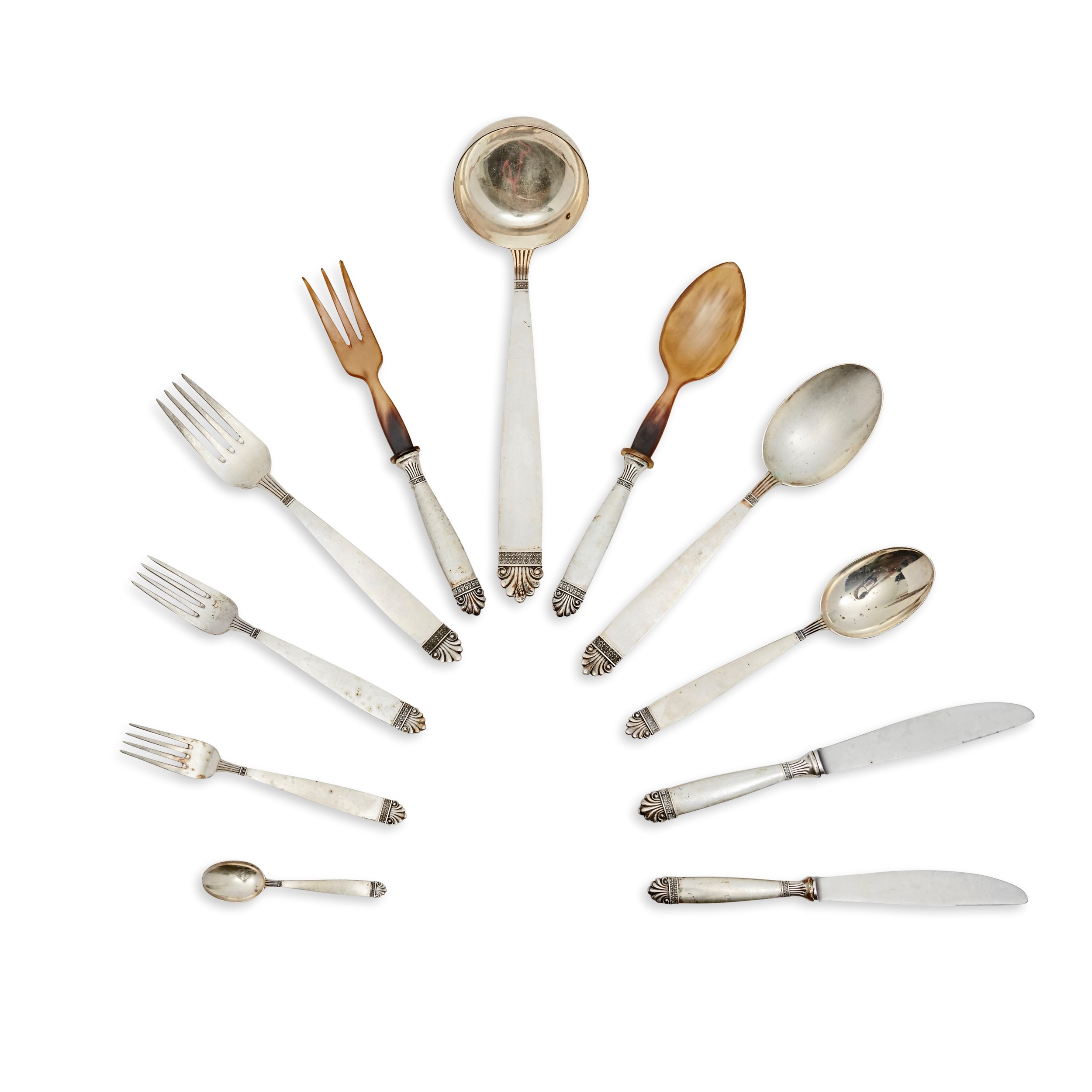 con decoro in stile francese, 75 pezzi: 12 forchette, 12 coltelli, 12 cucchiai, 12 forchette da frutta, 11 coltelli da frutta, 11 cucchiaini da caffè, 5 serviti (1 mestolo, 2 posate da insalata, 1 forchettone e 1 cucchiaio da arrosto).