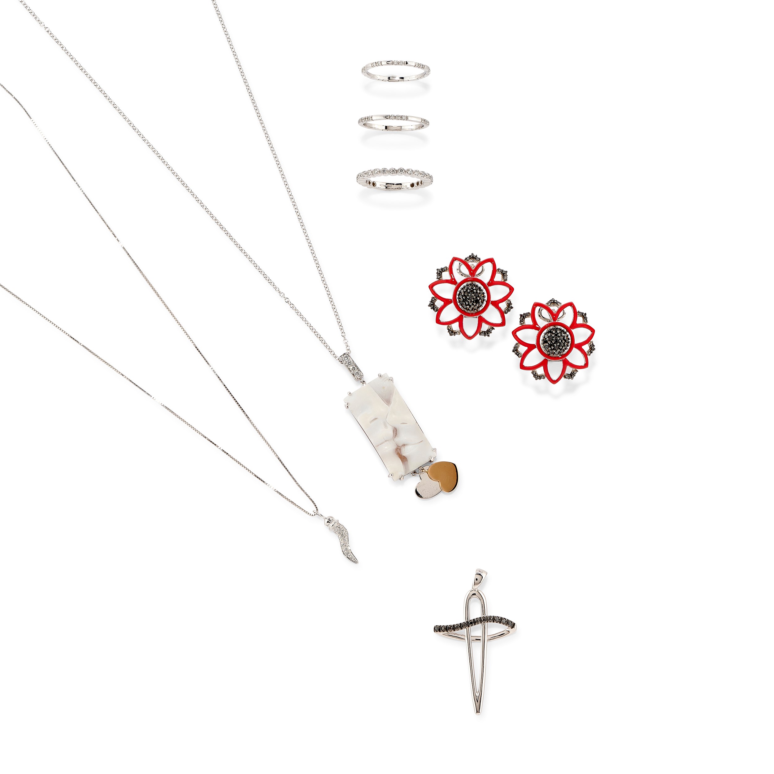 composti da due pendenti con catena, un pendente singolo, tre anelli e una coppia di orecchini decorati da diamanti taglio brillante incolori e neri, di differenti raffigurazioni. Peso g 35,40 misure 14 e 15 collane cm 42,00 e 50,00